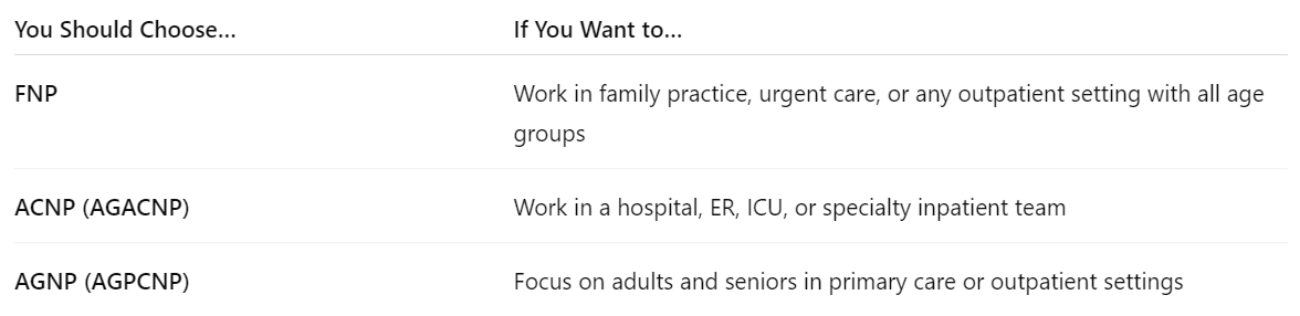 Choosing between FNP, ACNP, and AGNP depends on your clinical interests, preferred patient population, and work-life balance goals. Each path leads to a rewarding and impactful career. The key is choosing the one that aligns with where you see yourself thriving.